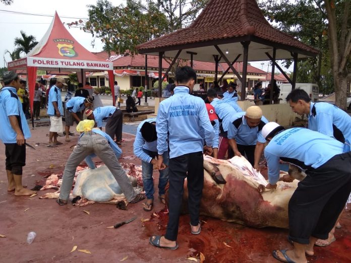 ragamlampung.com - Panitia Idul Adha Polres Tulangbawang memotong hewan qurban sebanyak 14 ekor. Terdiri dari 8 ekor sapi dan 6 ekor kambing.