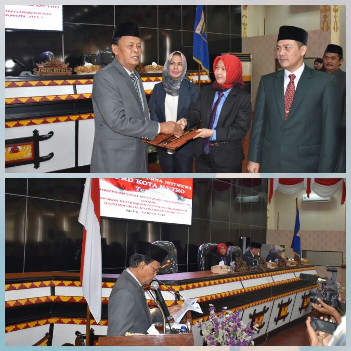 ragamlampung.com - DPRD Kota Metro menggelar Rapat Paripurna Istimewa tentang Penyampaian Surat Keputusan DPRD Kota Metro tentang Laporan Keterangan Pertanggungjawaban (LKPj) Walikota Metro Akhir Tahun 2017, yang berlangsung di Ruang Sidang setempat, Senin (30/4).