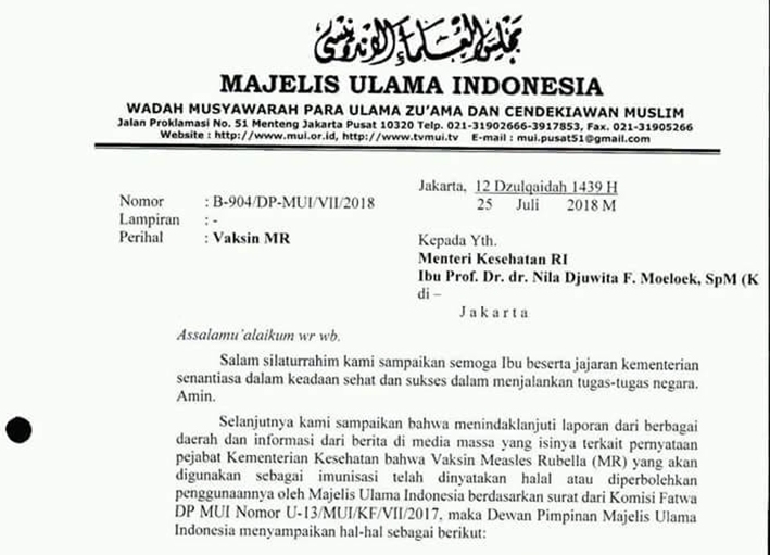 Surat dari komisi fatwa tidak menyatakan kehalalan vaksin MR atau kebolehan penggunaannya. Secara tegas surat tersebut menyatakan bahwa kehalalan vaksin MR merupakan syarat utama adanya dukungan dari komisi fatwa terhadap imunisasi MR.