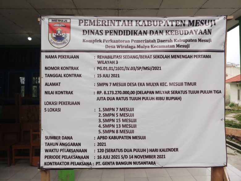 Padahal diketahui proyek rehabilitasi Sekolah Menengah Pertama Negeri 7 Mesuji wilayah 3 menelan anggaran yang cukup fantastis yakni sekitar Rp 8 Milyar lebih. Yang bersumber dari anggaran pemerintah belanja daerah APBD murni Pemkab Mesuji tahun 2021. Yang dilaksanakan oleh pihak kontraktor PT. Genta Bangun Nusantara. (santok)